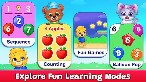 The application's design incorporates step-by-step number tracing guides, interactive counting exercises with animals and toys, and sequence learning activities. These features are not only engaging but also reinforce the math curriculum typically introduced in early education settings. The inclusion of modes like 'Car Mode' and 'Fishing Mode' ensures that while children have fun, they are also meeting key developmental milestones.