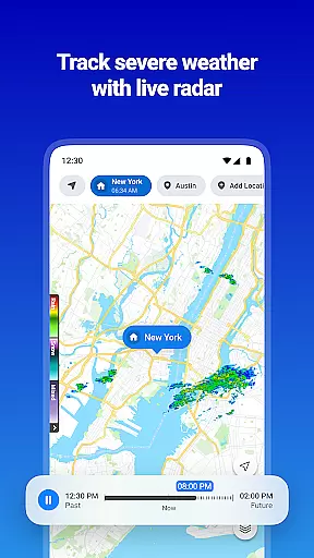 The app offers 24/7 local and national hourly weather updates, alongside down-to-the-minute and long-range forecasts tailored to custom locations. Its Future Radar feature allows users to track hazardous weather conditions across different regions, including specific areas like the West Coast and East Coast.
