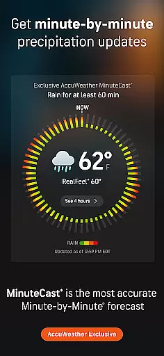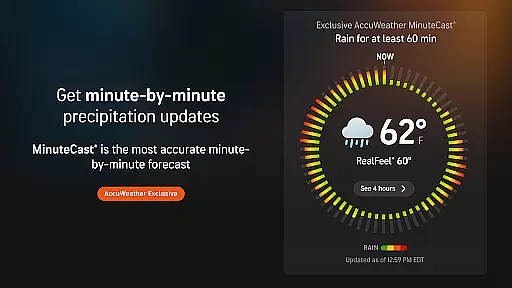AccuWeather offers an array of innovative features designed to provide users with the most accurate and actionable weather data available. One standout feature is MinuteCast®, which delivers hyperlocal forecasts detailing precipitation type, intensity, start, and end times for the next four hours at an exact street address or GPS location across 210 countries.