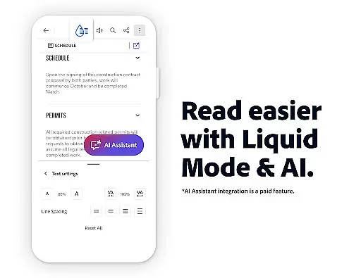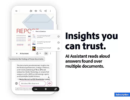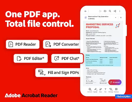 Adobe Acrobat Reader is a comprehensive productivity tool that serves as the world's most trusted PDF reader, editor, and maker. With over 635 million installs, it allows users to view, share, annotate, comment, and sign documents seamlessly within a single application. The app's recent major update introduces the Adobe Acrobat AI Assistant, which revolutionizes PDF interactions through advanced AI capabilities.