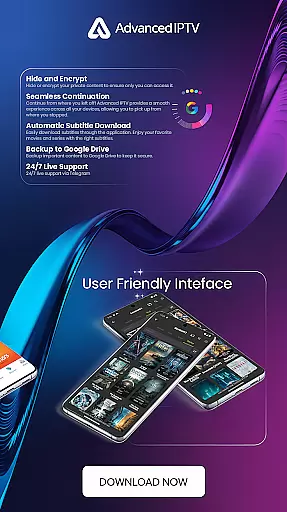 The application supports advanced features such as seamless continuation across devices, online subtitle downloads, and the ability to manage favorite channels for easy access. Additionally, users can download content for offline viewing and backup important data to Google Drive. With compatibility across various media players and support for Google Cast, Advanced IPTV ensures a versatile viewing experience.