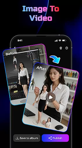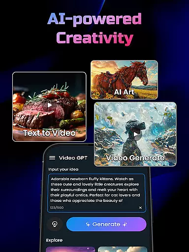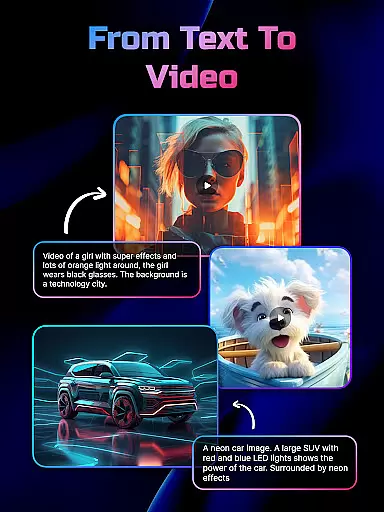 In addition to video generation, the app offers a Text-to-Image Generator, allowing users to create unique, art-inspired images from simple text descriptions. Another notable feature is the Image-to-Video Generator, which transforms static photos into captivating videos enhanced with smooth motion and 3D effects. These tools collectively ensure a versatile and intuitive content creation experience.