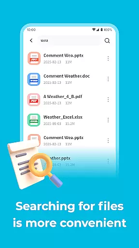 The app supports multiple formats including PDF, Word, and PPT, allowing users to rename, delete, or share documents with ease. This versatility ensures that users can manage their files effectively without being constrained by format limitations.