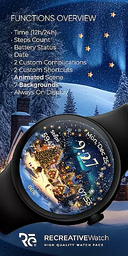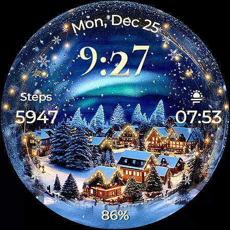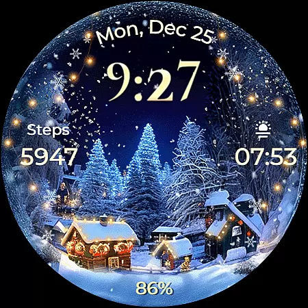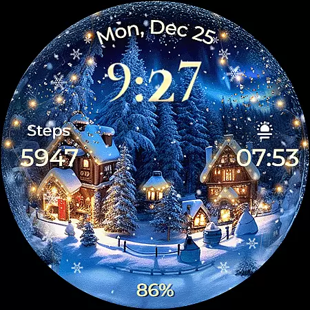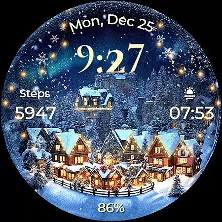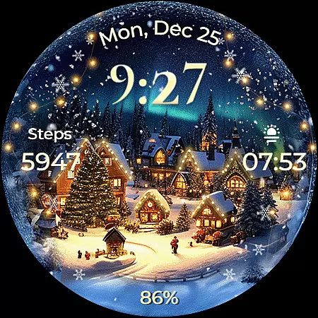 This Wear OS watch face stands out with its unique Christmas theme and animations. The animated snowfall combined with magical sparkles creates an immersive holiday atmosphere on your smartwatch display. Users can choose from seven distinct backgrounds to match their preferred style.
