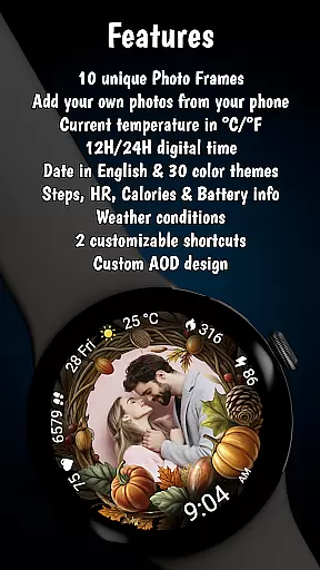 Autumn Photo Frames for WearOS is a lifestyle-enhancing watchface that combines personal memories with seasonal aesthetics. This app allows users to display cherished photos within beautifully designed autumn-themed frames directly on their smartwatch. With support for 10 unique frames and rich customization options, it creates an emotional connection while offering practical functionality.