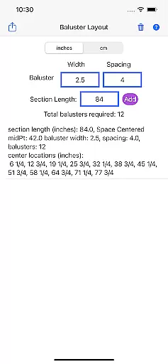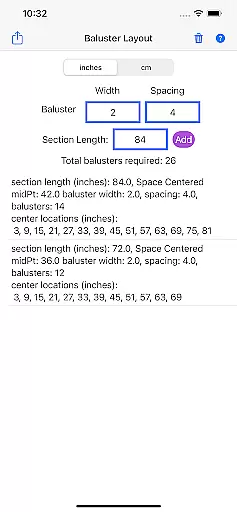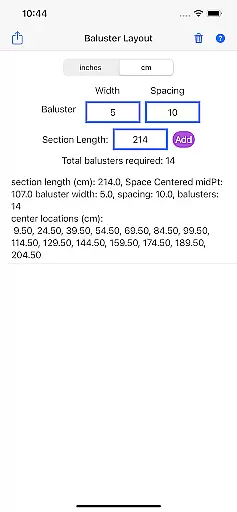 The app's unit flexibility allows users to work in either inches or centimeters, accommodating different measurement systems. Additionally, its detailed results provide a comprehensive breakdown of baluster requirements and placements, giving builders clear guidance for each project phase.