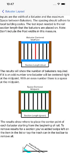 Baluster Layout is a specialized application designed for deck and stair builders who need precise calculations for baluster spacing. The app's core functionality lies in its ability to determine the exact number of balusters required and their optimal placement to meet building code standards.
