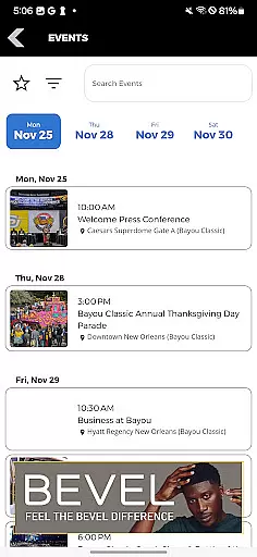 Bayou Classic offers an array of features designed to enhance your event experience. The intuitive event browser allows you to filter and search through various activities, helping you create a personalized itinerary that matches your interests. Whether you're looking for specific sports events, cultural performances, or networking opportunities, this feature has got you covered.