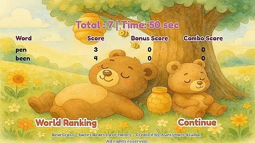 BearCross: Word Puzzle Ranking is an engaging word game that combines fast-paced spelling challenges with adorable bear characters. The core gameplay revolves around forming real English words from randomized letter grids, rewarding players with honey jars that extend playtime. With a unique twist, a mischievous bumblebee chases players in the final 30 seconds of each round, adding strategic depth and excitement.