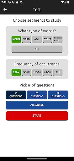 Users can customize their study sessions by choosing to learn words based on frequency or part of speech. The testing feature allows flexibility in quiz length, while the tracking mode helps monitor improvement over time, ensuring steady progress towards Hebrew language mastery.