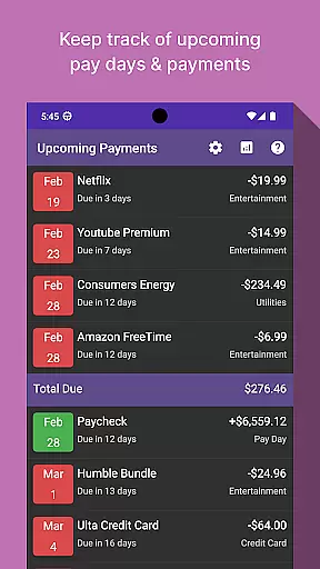 Bill Manager offers several notable features that set it apart in the finance app category. First and foremost is its intuitive bill tracking system, which automatically calculates which bills are due based on the user's current date and next payday. This feature not only lists pending payments but also provides detailed information about each bill, including amount due and exact due date.