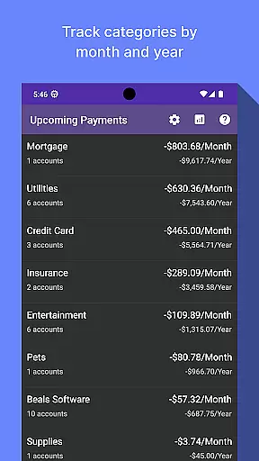 A key feature of Bill Manager is its ability to display which bills are still pending payment from the current date up to the next payday. It provides essential details such as payment amounts and due dates, ensuring users never miss a payment deadline again. Additionally, the app includes an analytics view that allows users to examine their spending patterns by category and account, broken down by month and year.
