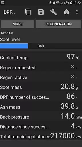 bimmer-tool stands out with its diverse feature set tailored for BMW diagnostics. The app enables users to read detailed DPF regeneration status, request regeneration when needed, and reset adaptation values after filter replacement. It provides access to crucial engine parameters such as exhaust fumes pressure, injector adjustments, and various actual vs expected values for air mass and fuel pressure.