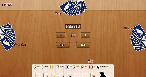 The AI opponent provides challenging competition through sophisticated bidding and playing strategies. The game also implements smooth touch controls for easy card management and clear visual indicators for bids and scores. Additional features include two predefined rule sets for quick starts, automatic score tracking, and detailed game statistics. The clean, intuitive interface ensures players can focus on strategy without being distracted by complex mechanics, making Blackbird accessible to both newcomers and experienced card game players alike.