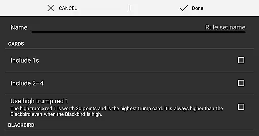 Blackbird boasts several distinctive features that enhance the classic trick-taking experience. The game's most notable aspect is its extensive rule customization system. Players can toggle various options such as including 1's worth 15 points, implementing low/high/10.5 Blackbird card rules, and deciding whether to remove or allow unrestricted play of the Blackbird card. These options, combined with adjustable game-winning scores and bonus points for taking the most tricks, create a highly personalized gaming experience.