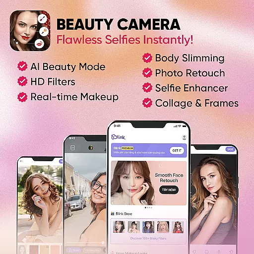 Blink Beauty Cam is a feature-rich photo editing application designed specifically for beauty enhancement. The app allows users to take flawless selfies with advanced face beautifying filters and professional makeup tools. With its powerful AI technology, Blink offers over 50 makeup styles ranging from natural looks to bold, trendy themes. Users can edit facial features in detail, including reshaping face contours, adjusting nose shape, brightening skin tone, and whitening teeth.