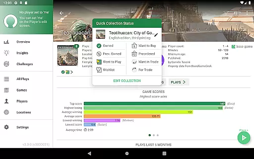 BG Stats stands out with its robust feature set tailored specifically for board gamers. The app provides extensive collection management capabilities, allowing users to track owned games, wishlists, and acquisition details. Its play tracking system supports complex scenarios including expansions, anonymous players, and team scores, while offering over 2300 game-specific score sheets for accurate data entry.