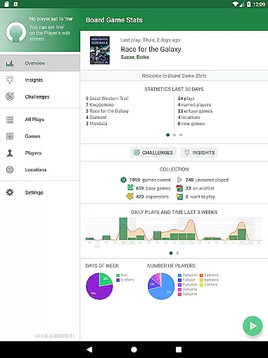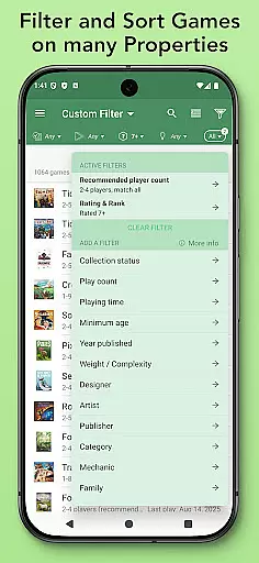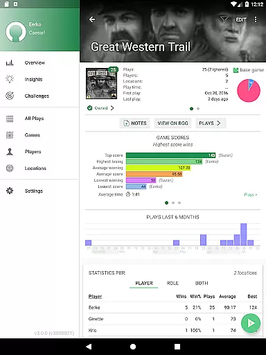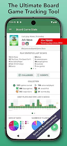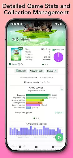 The app's collection management tools enable users to organize games by status, version, and custom filters. Play tracking includes detailed scoring rules, team play options, and integration with popular gaming platforms. Advanced statistics provide pie charts, play duration graphs, and cost-per-play analysis. BG Stats also supports dark mode, landscape orientation, and tablet screens, ensuring a seamless user experience across devices.