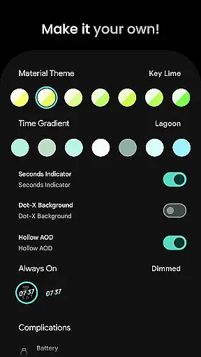 The app provides users with over 60 material theme and time gradient options, allowing for personalized aesthetics. It includes four complication slots, am-pm indicators for 12-hour format users, and dual battery support through the Phone Battery Complication app. User configurations extend to Always-On Display settings, date format options, and toggles for features like Dot-X Background and Hollow AOD. These comprehensive customization capabilities ensure that each user can tailor their watch face to their specific preferences and needs.