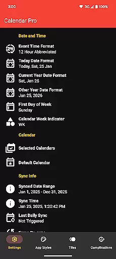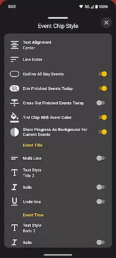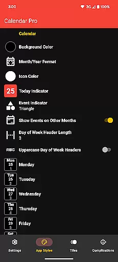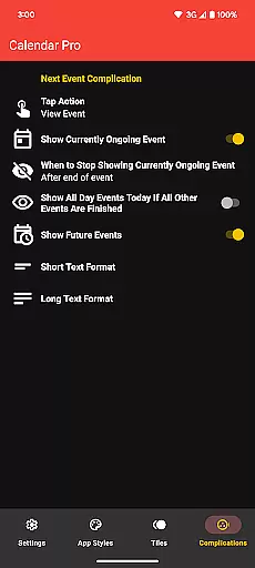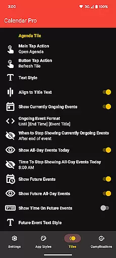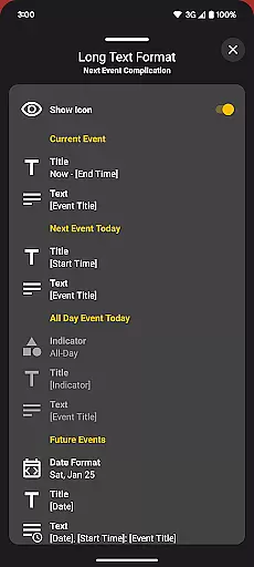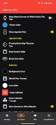 The app offers multiple visualization options including month view, agenda, and various complication styles. Users can personalize nearly every aspect of the interface, from theme colors to event indicators, ensuring the display matches their preferences and needs. These customization capabilities extend to all components including tiles and complications.