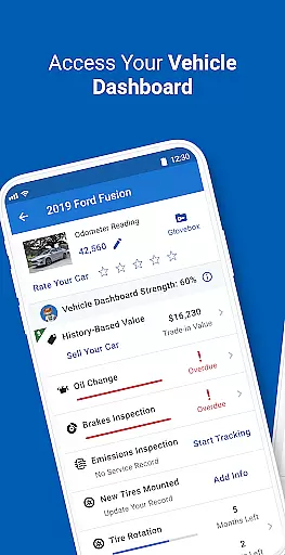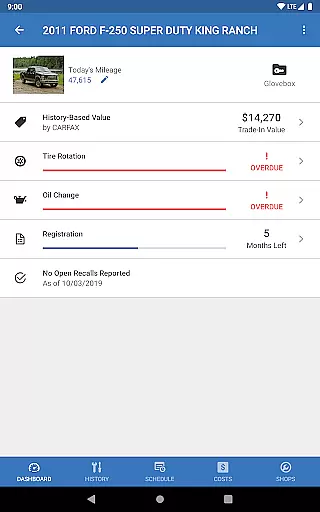 One of the app's key features is its customized dashboard that displays important information such as when your vehicle is due for oil changes, tire rotations, filter replacements, and inspections. Additionally, users can view their car's estimated value and track fuel efficiency through mileage logging.