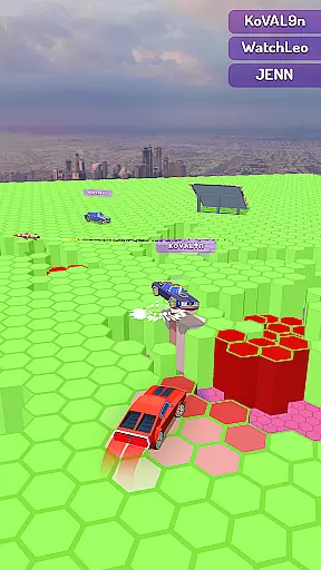 The game provides a genuine off-road drifting battle where every turn and movement reflects real-world physics. The platform tiles disappearing behind each car's path add an extra layer of challenge, requiring players to master their control over the vehicle while strategizing their moves.