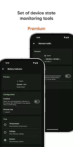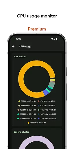 The app's strength lies in its specialized tools. Users can test display quality with the screen tester, measure environmental noise levels, and track network traffic speed. Premium subscribers benefit from advanced features such as deep interface customization, configurable home-screen widgets displaying vital statistics, and professional monitoring tools for battery properties and CPU frequency usage.