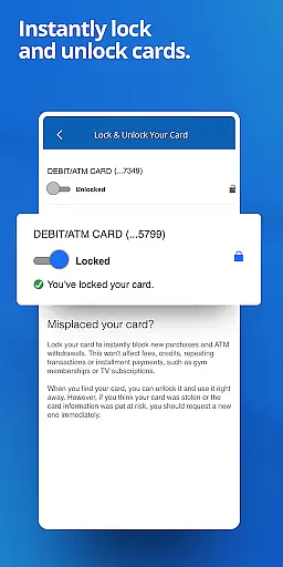 In addition to monitoring your account activity, the Chase Mobileu00ae app enables you to lock and unlock your cards directly from the app interface. This feature gives you control over your card's usage, adding an extra layer of security when your card is not in use or has been misplaced. By integrating these security protocols, Chase Mobileu00ae ensures that your funds are accessible only by you, providing peace of mind while managing your finances on the go.