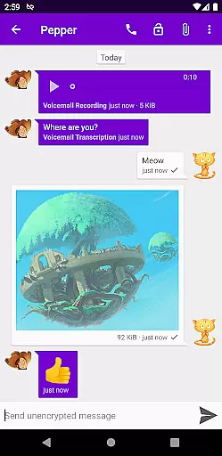 The app supports messages that combine both media and text, accommodating diverse communication styles. Whether it's photos, videos, or animated media, Cheogram ensures that these files are shared with ease and displayed unobtrusively within conversations.