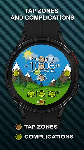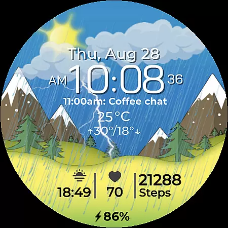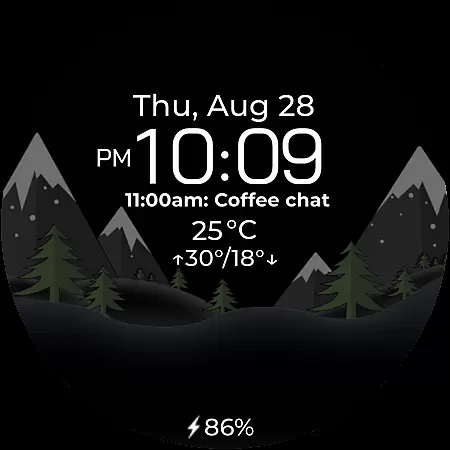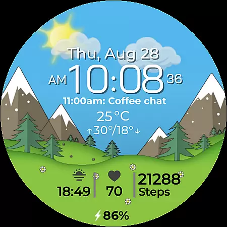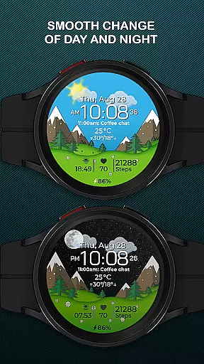 The watch face displays essential information such as time, date, weather, and battery level while offering interactive tap zones and complications that allow users to personalize their experience. Its smooth day-night transitions and seasonal changes make it an ideal choice for users who want their smartwatch to adapt to their lifestyle and environment seamlessly.