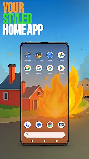 A key feature is the ability to set this as the default home app through device settings, while still allowing easy reversion to previous launchers. The app also integrates elements from the City On Fire game, offering themed wallpapers and exciting gameplay directly accessible from the home screen. These combined features deliver an engaging user experience that blends practical utility with entertainment value.