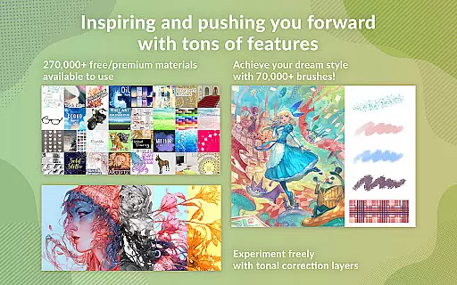 The app's brush engine is another highlight, offering over 70,000 customizable brushes created by artists worldwide. Users can also download more than 270,000 materials, including unique textures and effects, enhancing creativity and productivity. Features like Line Stabilization and Vector Layers ensure precision and scalability in every project.