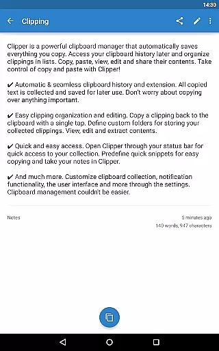 The app offers advanced features like unlimited clipping storage, dynamic values for custom snippets, and robust search capabilities. Users can organize their clippings into folders, edit contents directly, and even set up quick-access snippets for frequently used items. With its seamless integration and user-friendly interface, Clipper+ transforms the way you handle copy-paste operations, making it an essential tool for both personal and professional use.