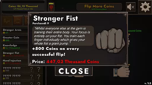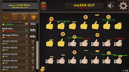 Additional features include a coin-generating pile that passively produces currency over time, a high-risk GAMBLE upgrade that can double or eliminate current holdings, and a straightforward +1 coin upgrade for incremental progress. Players can track their performance through detailed statistics and work toward completing 93 achievements. The game also incorporates challenges with permanent rewards and maintains immersion with authentic coin-flipping sound effects.
