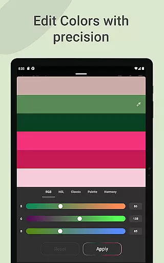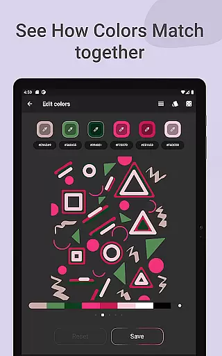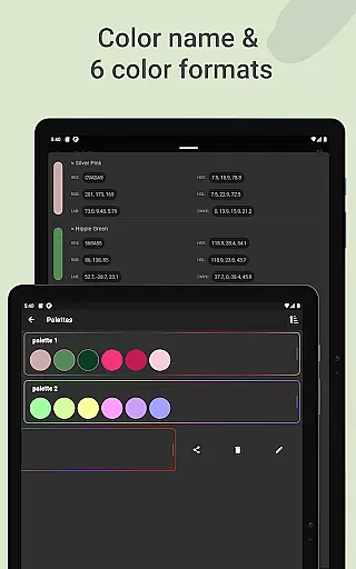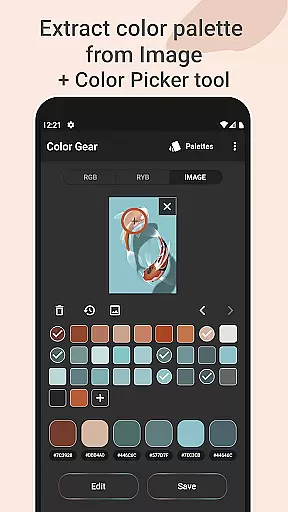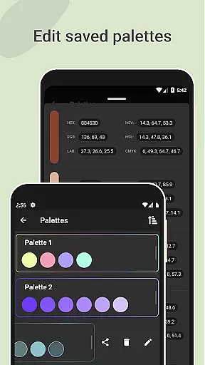 The application stands out with its ability to turn photos into palettes using automated algorithms or manual selection with the Hex Color Picker. Users can save palettes along with images as collages and share them effortlessly. Additionally, precise color value editing (Hue, Saturation, Lightness) ensures accurate palette creation. All these functionalities are available offline, making it a reliable companion for creative projects anywhere, anytime.