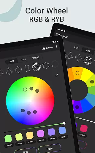 Color Gear distinguishes itself through a variety of robust features tailored for color professionals. The app's support for both RGB and Itten Color Wheels caters to different design needs, from digital media to traditional art. With over 10 color harmony schemes, users can experiment with various combinations to find the perfect palette. The option to input specific HEX or RGB color codes allows for targeted exploration of color harmonies, providing a personalized experience.