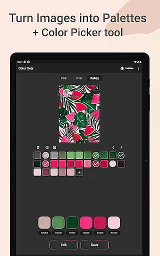 One of the standout features is the ability to extract palettes directly from images. Using sophisticated algorithms, the app automatically detects colors within photos, while the Hex Color Picker enables manual selection. Advanced color editing tools let users fine-tune Hue, Saturation, and Lightness with precision. Furthermore, seamless management and sharing of palettes in six color formats (RGB, HEX, LAB, HSV, HSL, CMYK) enhance workflow efficiency. These comprehensive features make Color Gear an indispensable tool for color manipulation.