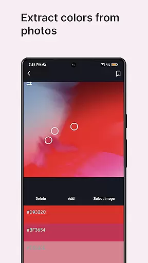 Additionally, the application provides functionalities such as color combinations, which are crucial for creating professional palettes. A color picker tool allows users to extract colors from their surroundings using the camera, while image colors functionality can derive palettes from existing images. These features ensure that no matter the project or inspiration source, users have everything they need at their fingertips.