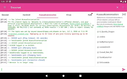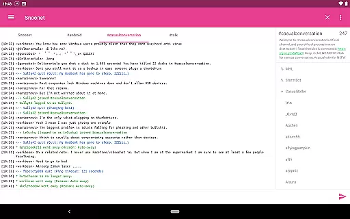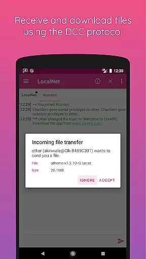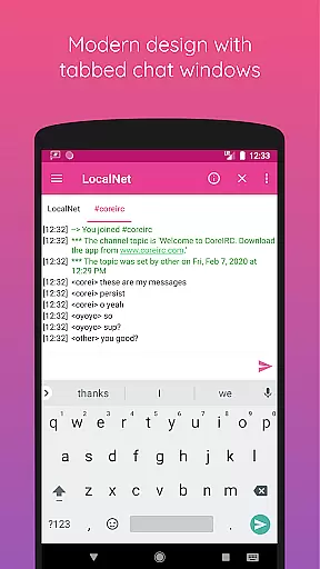 CoreIRC also shines with its modern Android design and additional features like background connectivity, command autocomplete, and theming options. These aspects contribute to a seamless user experience, whether you're managing chats or monitoring system stats.