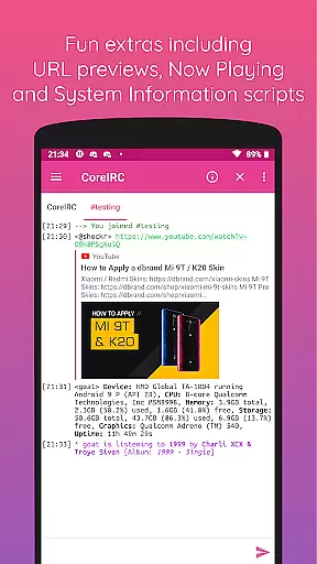 The application stands out with its advanced notification system, enabling users to customize alerts based on channels, senders, or specific messages. Additionally, CoreIRC offers practical extras such as inline URL previews and now playing scripts, making it not only functional but also enjoyable to use. Designed with Android's Material principles, the app delivers an intuitive and visually appealing experience.