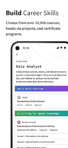 With Coursera, users can learn job-specific skills via practical projects, pursue professional certificates for in-demand roles, specialize in specific fields, or even earn bachelor's and master's degrees. The platform supports career growth by offering flexible schedules, offline access to content, and multi-device compatibility.