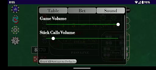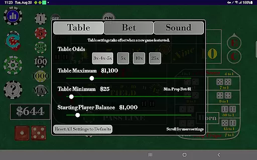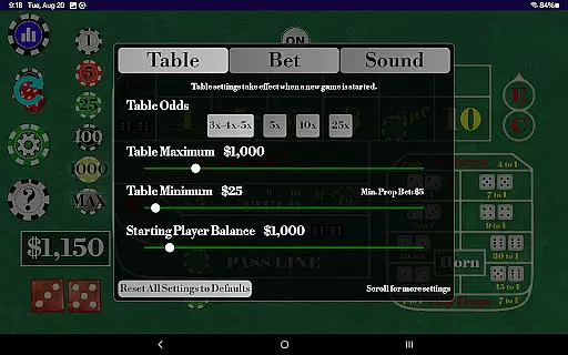 Players can monitor roll history statistics such as points made, max points achieved, and lucky sevens versus seven outs. The app supports numerous betting options including pass line, don't pass, come, place buy, lay, field bets, and more. Additionally, users have the flexibility to modify table minimums, maximums, odds, and starting balances, allowing personalized gameplay sessions tailored to individual preferences.