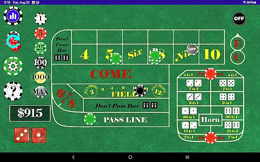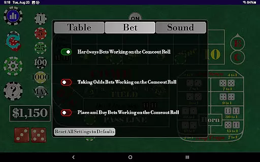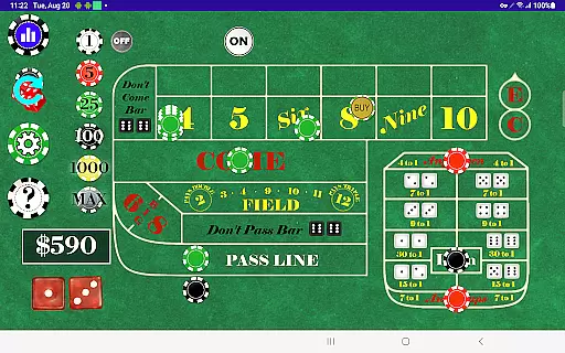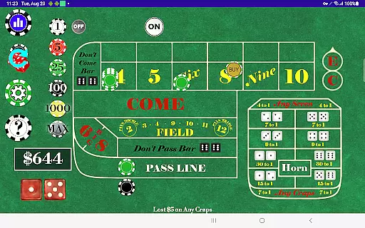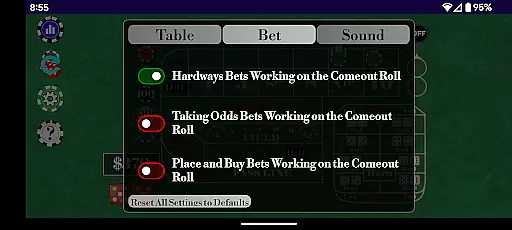 With multiple Table Odds settings and support for a wide range of bets, Craps Alone ensures that each user's experience is both varied and engaging. The ability to easily toggle individual bets and control whether different bet types are active during the come-out roll adds another layer of realism. This level of detail and customization helps bridge the gap between digital play and live dealer interaction, offering a premium-quality solo gaming experience.