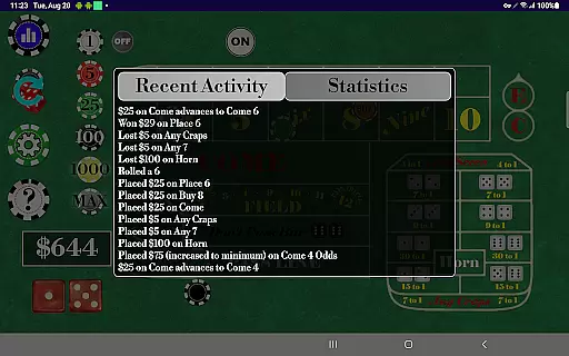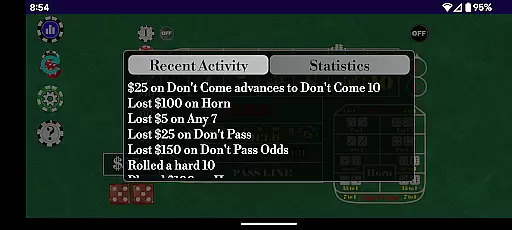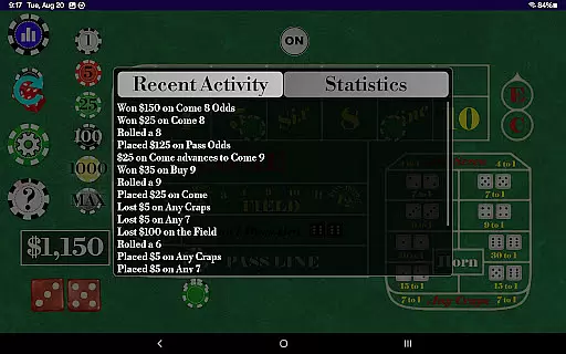 Although Craps Alone does not feature live dealers, it excels in delivering high-quality simulations that bring the casino to your device. The developers have focused on creating an immersive environment through superior graphics and sound design. Users can scroll through a detailed list of recent activities including dice outcomes, bets placed, wins, and losses, enhancing the feeling of being at a live table.