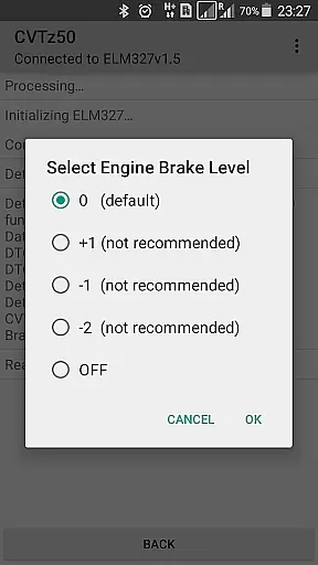 CVTz50 offers a comprehensive suite of features tailored for CVT transmission diagnostics. Users can read and clear diagnostic trouble codes for both the CVT and engine systems, ensuring optimal vehicle health. The app also enables adjustment of engine braking levels, Idle RPM, and Ignition timing, with specific functions like Idle air volume learning available for certain Nissan Murano models produced before 2010.