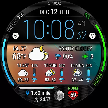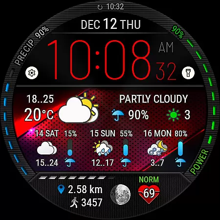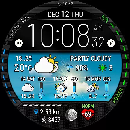 Digital Weather Watch face P5 stands out with its comprehensive feature set tailored for modern smartwatches. One of its key highlights is the detailed 3-day weather forecast powered by The Weather Channel or other system weather sources, ensuring users are always prepared for changing conditions.