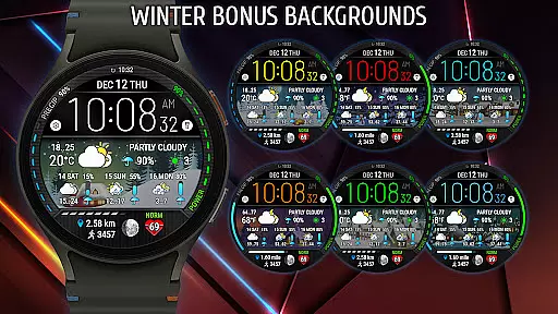 The watch face displays essential information such as digital time, current weather conditions, moon phases, heart rate, steps, and distance traveled. With 8 color themes and 16 background options (including a Winter bonus pack), users can personalize their watch to match their style. Additionally, two customizable app shortcut areas allow quick access to frequently used applications.