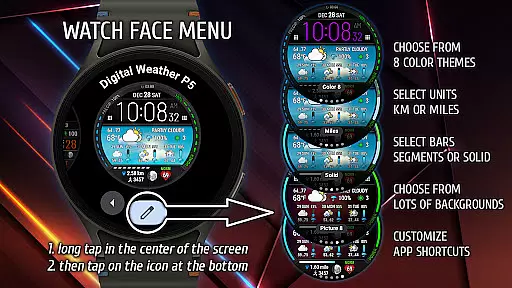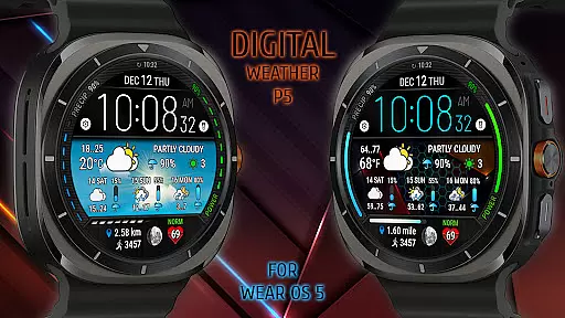 Digital Weather Watch face P5 is a feature-rich watch face designed specifically for Wear OS 5 (API 34+) devices, including Samsung Galaxy Watch 7 and Ultra. This advanced application offers users an interactive experience with its 3-day weather forecast, multiple customization options, and health tracking features.