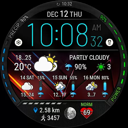 The watch face displays a detailed 3-day weather forecast directly on your wrist, allowing you to plan your activities with confidence. By showing current weather conditions alongside future predictions, it provides a comprehensive overview of what to expect in the coming days. This feature is particularly beneficial for individuals who need to stay prepared for changing weather patterns.
