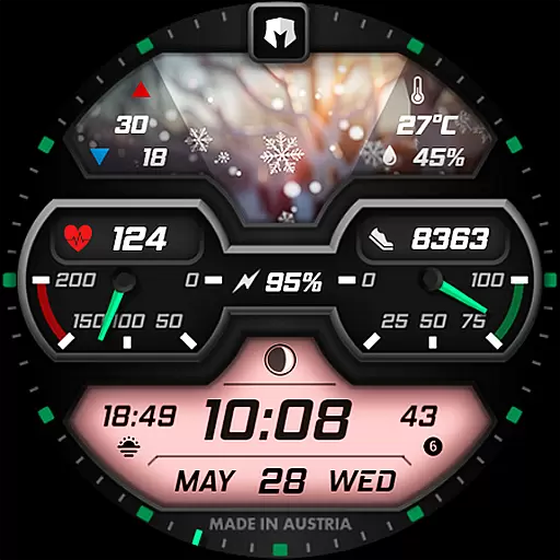 The watch face design by Dominus Mathias supports two customizable complications, allowing users to tailor their experience according to personal preferences. With the companion app, users can easily configure these settings, ensuring that their Wear OS 5+ device always displays the most relevant information.